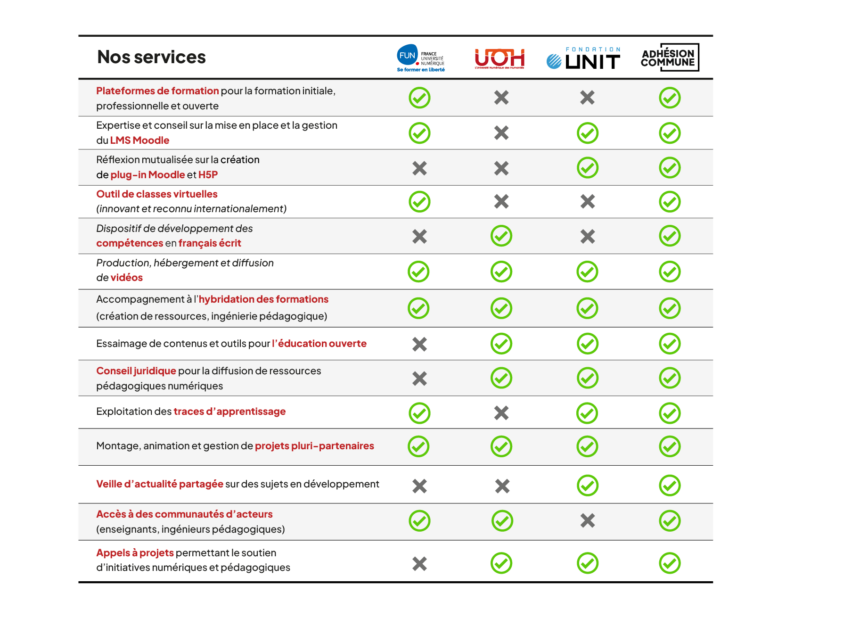 Afin de rendre plus lisible l’offre proposée, le tableau ci-dessous présente les services accessibles selon le type d’adhésion choisi : adhésion commune ou adhésions spécifiques à UNIT, UOH ou FUN.